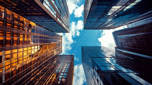 skyscraper, city, urban, building, modern, architecture, glasses, steel, tower block, business, concrete, exterior, downtown, city landscape, tall, commercial, perspective, cloudy, blue, white, cloud, sunlight, daylight, outlook, view, upward, industrial, metal, facades, window, structure, construction, contemporary, skyline, city landscape, high, metropolis