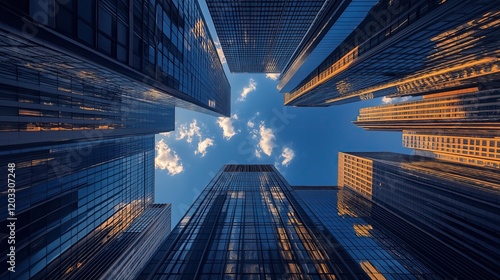 Low-angle view of towering skyscrapers with reflective glass surfaces.