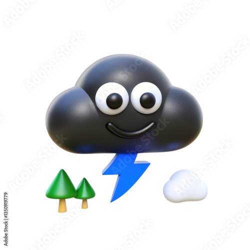 Low-carbon 3D concept. Smiling cloud with lightning, trees, and a small cloud illustration.
