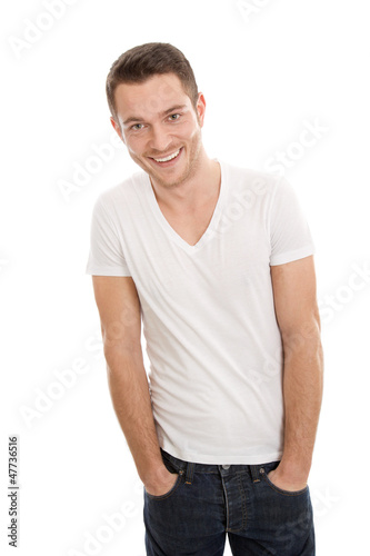 man, isolated, white, young, casual, male, release, jean, casual, cool, youth, model, t-shirt, fashionable, lifestyle, styling, unshaved, gesture, mimic, happy, an, person, alone, happy, high spirits, student, study, beard, plain, commercial, modern, slim, white, teeth, blond, good mood, masculine, upper body, portrait, fine-looking, beauty, masculinity