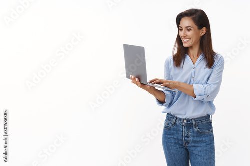 Lucky professional good-looking adult female entrepreneur writing text message coworker, smiling joyfully, hold laptop, tap keyboard, smiling cheerful look computer display satisfied bank account