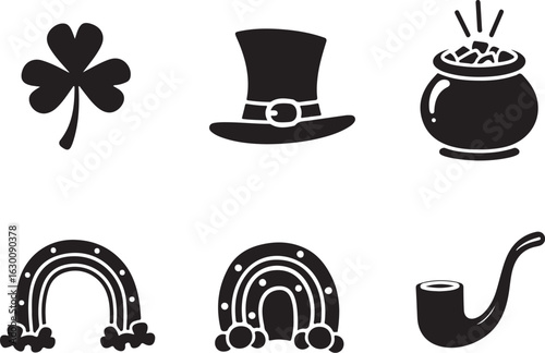 luck, shamrock, day, leprechaun, hat, rainbow, pot, gold, pipe, clover, icon, symbol, green, celebration, holiday, tradition, irish, fortune, wealth, magic, fantasy, culture, festive, seasonal, element, design, graphic, art, illustration, drawing, simple, silhouette, black, white, clip art, symbolic, blessing
