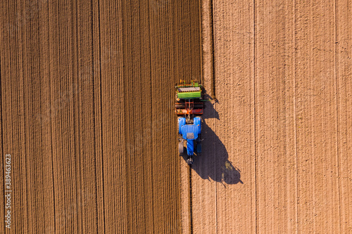 Luftaufnahme auf einen blauen Traktor beim Umpflügen eines Ackers hinterläßt Spuren auf dem Feld