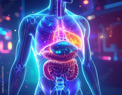 anatomy, organ, lung, liver, stomach, three-dimensional, rendering, human, body, internal, medicals, science, health, illustration, vibrant, glowing, colourful, digital, model
