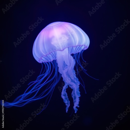 Luminous Blue Jellyfish Floating in Dark Blue Water