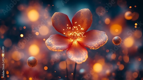 flower, aglow, glowing, ambient, setting, light, bloom, blossom, flower petals, orange, red, dark, background, bokeh, sparkle, shine, glistering, vibrant, magical, mystical, fantasy, surreal, abstract, art, digital, illustration, design, cosmic, nebula, night, star, sphere, particle, energy, flames, warmth, beauty, nature, artistic, creativity, detailed, intricate