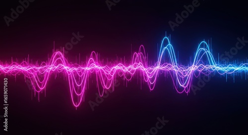 waveform, audio, sound, music, signal, frequency, amplitude, spectrum, equalizer, pulse, rythm, beat, vibration, wave, pink, blue, magenta, cyan, neon, vibrant, colourful, gradient, purple, violet, fuchsia, turquoise, electric, aglow, glowing, abstract, futuristic, technology, digital, electronic, science, physics, datum, visualisation, graphic, background, modern, dynamic, energy, power, light, glow, line, curve