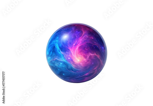 Luminous spherical orb swirling with blue pink purple cosmic nebula patterns and stars, isolated on a transparent background
