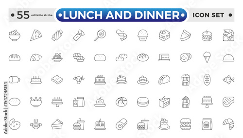 icon, lunch, breakfast, dinner, fast food, salad, sushi, soup, snack, chicken, fish, pizza, steak, garnish, pasta, sandwich, taco, burger, container, sauce, dessert, cutlery, planning, meal, hot drink, tea, noodle, vegetarian, food, line, editable, rice, set, collection, plate, vector, illustration, chips, menu, cheesecake, combo, meat, ketchup, symbol, signs, cookery, dining, favor