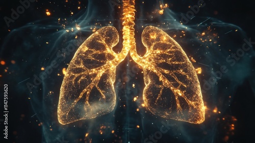 Lungs breathing oxygen, airflow depicted with glowing lines, dark anatomical grid,