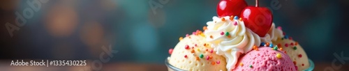 Luscious ice cream sundae, colorful sprinkles & cherry , delicious, photography