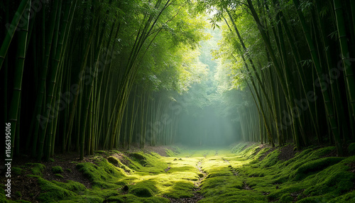 Lush bamboo forest with tall green stalks, pathway leading through center, casting soft glow in shaded environment.