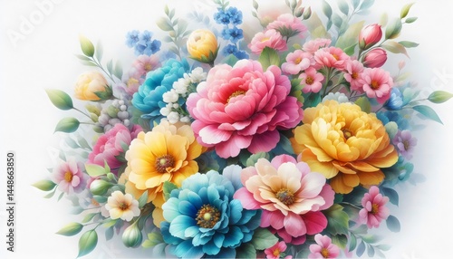 colourful, vibrant, peony, rose, pink flower, yellow flower, blue flower, bouquet, arrangement, art, painting, drawing, spring flower, summer flowers, beautiful, decorative, design element, isolated, white background, romantic, elegant