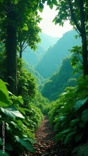 Lush coffee plants thrive amidst vibrant rainforest canopy , agriculture, sustainability