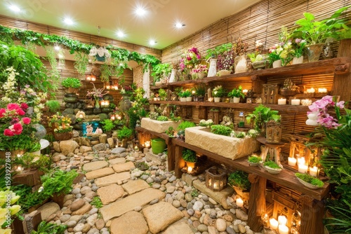 floral, shop, garden, zen, warm, plant, flower, nature, decor, rustic, candle, rock, path, water, fountain, shelf, wooden, pot, vase, green, brown, light, cosy, relaxing, interior, design, home, decorating, display, arrangement, natural, art, still, life, decorative, object, stone, botanical, peaceful, stylish, charming, boutique, exquisite, ambience, elegant