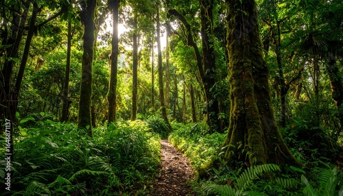 forest, jungle, path, tree, nature, sunlight, green, plant, fern, moss, wildlife, hiking, adventure, landscape, photo, scenic, tropical, beauty, ecology, environment, trekking, explore, travel, lush, vibrant