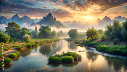 nature, sky, water, sunlight, ai, horizontal, idylli, no people, photo, calmness, twilight, wilderness, color image, dramatic sky, morning, scenic, cloud, flowing water, green, lake, mountain chain, outdoors, sunset, tranquil scene, aerial view, crystal, dawn, dusk, flowing, flying, fog, growth, highway, hiking, lush, majestic, meadow, north, peak, scenery, simplicity, springtime, stream, stunning, summit, sunbeam, sunrise
