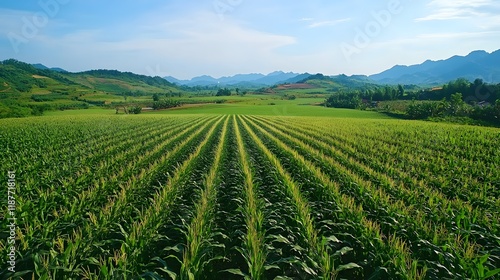 cornfield, corn, maize, agriculture, farming, field, row, green, plant, leaf, landscape, mountain, hill, sky, blue, cloud, sunlight, rural, countryside, nature, scenery, vista, view, panoramic, summer, daytime, growth, harvest, fertile, dirtied, vegetation, environment, ecology, background, image, photo, picture, serenity, peaceful, tranquil, beauty