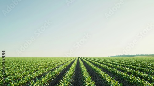 Lush green cornfield stretches under clear sky, symbolizing growth and abundance. rows of crops evoke sense of tranquility and harmony with nature.