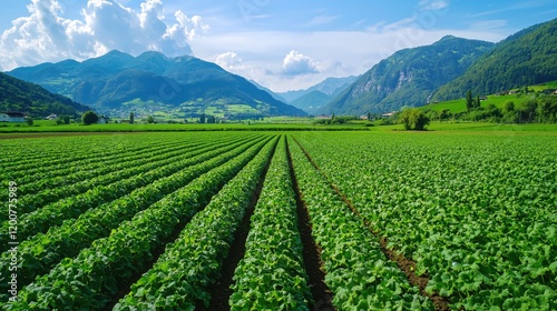 Lush Green Crop Field in Mountain Valley Scenic Landscape
