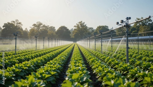 agriculture, farming, irrigation, crop, field, green, plant, row, sprinkler, growing, cultivation, horticulture, farmland, plantation, crop, dirtied, water, greenery, harvest, rural, countryside, nature, sunny, landscape, healthy, fresh, produce