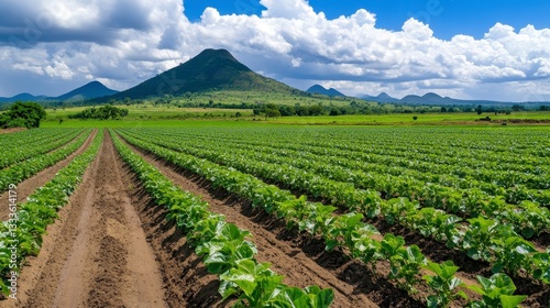 farmland, agriculture, landscape, field, crop, vegetation, hill, sky, cloud, rural, countryside, green, plant, nature, farming, cultivation, growth, dirtied, row, agricultural, land, scenic, outdoors, daytime, bright, sunlit, vibrant, pastoral, scenic view, natural, environment, ecosystem, cultivated, harvest, planting