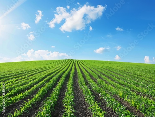 Lush Green Crops Fields Under Blue Sky - Agronomic Growth in Scenic Landscape