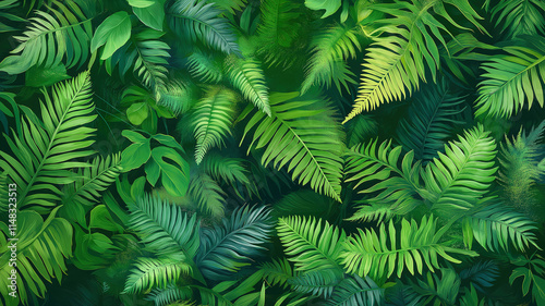fern, leaf, jungle, forest, nature, green, vibrant, plant, tropical, foliage, botanical, background, wallpaper, pattern, texture, closeup, design, spring, summer, lush, fresh, natural, environmentally friendly, organic, decorative, design element, photo, illustration, background image, poster, green leaf, floral pattern