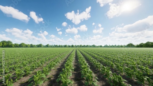 field, green, plant, row, agriculture, farming, crop, dirtied, sunny, sky, cloud, blue, bright, day, summer, nature, landscape, rural, countryside, growth, vegetation, leaf, stem, sunlight, horizon, tree, timberland, line, pattern, texture, background, image, photo, picture, scene, view, earth, ecology, environment