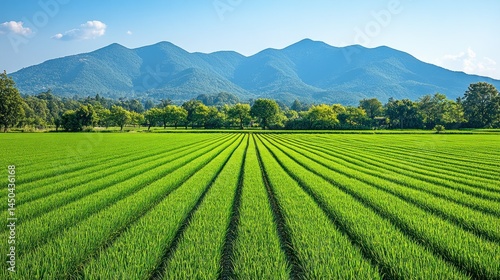 field, green, mountain, sky, rural, landscape, nature, crop, farmland, agriculture, vegetation, plant, tree, blue, horizon, beauty, scenic, view, fresh, vibrant, lush, growth, organic, cultivated, row, line, parallel, perspective, farm, summer, peaceful, serene, tranquil, healthy, abundant, fertile, elevation, outlook, expansive, natural, cultivation, countryside