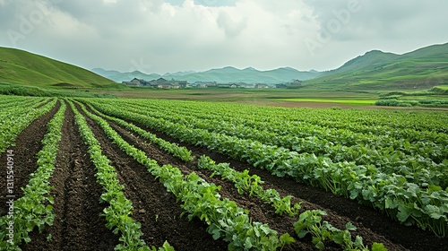 agriculture, landscape, field, crop, farming, row, green, nature, dirtied, earth, cultivation, environment, rural, outdoors, sky, plant, growing, produce, land, horizon, mountain, hill, vale, village, distant, cloudy, vegetation, fertile, sunlight, summer, springtime, fresh, healthy, natural, growth, harvest, cultivate, aerial, farm, country, scenic, wide, huge, pattern, perspective, distance, open