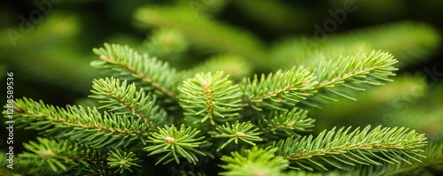 Lush green fir tree branches close-up, nature background, Christmas card design