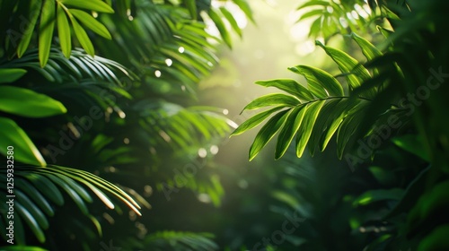 Lush Green Foliage in Sunlit Forest, Vibrant Tropical Jungle Scene