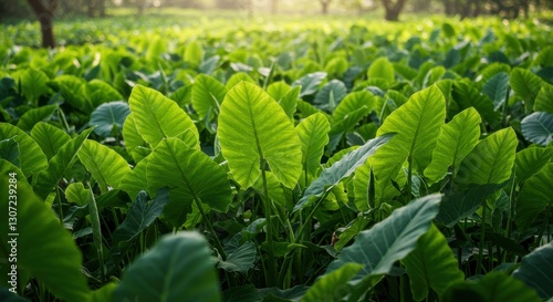 Lush green foliage of taro plants thriving in a sunlit agricultural field