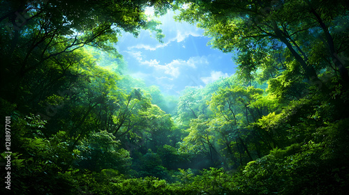 forest, tree, nature, green, leaf, sunlight, sky, daylight, canopy, wood, lush, vibrant, bright, summer, peaceful, serene, tranquil, calm, hope, fresh, clean, pure, environment, ecology, ecosystem, wildlife, habitat, landscape, scenic, view, background, image, photo, picture, digital artwork, illustration, artwork, graphic, design, visual, art, creative, aesthetic, beauty, wonder, marvellous, magical