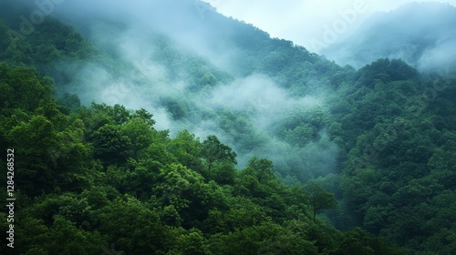 Lush Green Forest Landscape with Misty Mountains and Fog Creating a Serene Atmosphere