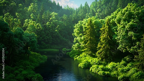 Lush Green Forest Surrounding Crystal Clear River in Sunlight