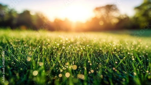 Lush green grass glistens with morning dew under soft sunlight,