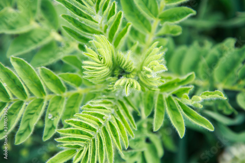 Lush green grass. Spring background. Drops of dew on the leaves. Copy space. Fresh bright texture.
