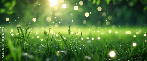 Lush green grass, sunlit meadow, dew drops, bokeh effect, morning light, ethereal atmosphere, macro photography, nature close-up, soft focus, dreamy landscape, golden hour, magical forest floor, vibra