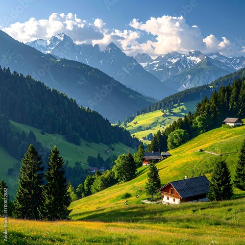 Lush green hillsides and valleys meet towering snow-capped mountains in a picturesque alpine landscape, showcasing charming homes nestled amidst the natural beauty.