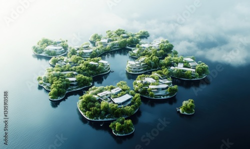 Lush green islands with modern architecture in calm water, aerial view, ideal for eco-tourism ads