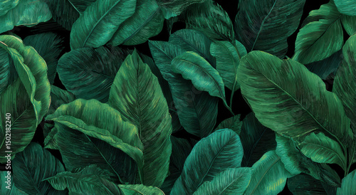 leaf, greenery, tropical, foliage, nature, botanical, plant, background, texture, vibrant, lush, decorative, pattern, organic, natural, exotic, design, fresh, environment, garden, summer, jungle, palm, detailed, artistic, illustration, closeup, rich, deep, shades, colours, aesthetic