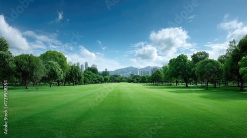 Lush Green Meadow with Distant Cityscape Under a Blue Sky with Fluffy Clouds in Daytime Wide Panorama