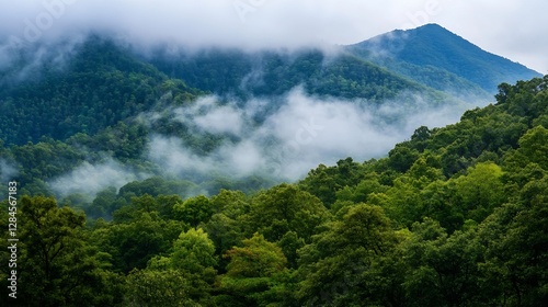 Lush green mountain landscape with mist enveloping the hills creating a mystical atmosphere : Generative AI