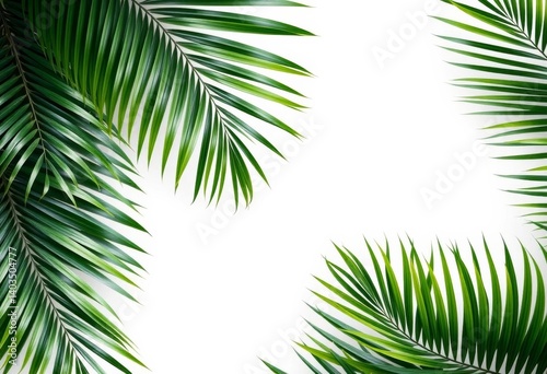 Lush green palm leaves form a vibrant frame on a pristine white background, leaves, palm