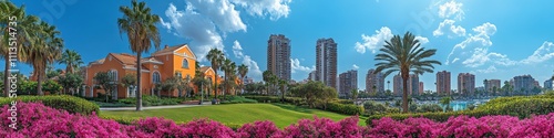 lush green park, blooming oleander trees, palm trees and residential buildings background