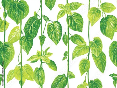 leaf, plant, philodendron, basil, vine, green, foliage, watercolor, illustration, pattern, seamless, botanical, nature, texture, background, stem, sprig, drawing, vibrant, fresh, growth, detail, artwork, design, organic, natural, bright, garden, herb, white, surface, closeup, artistic, decorative, element, tropical, jungle, wallpaper, textile, summer, spring, beauty, elegance, flora, indoor, studio