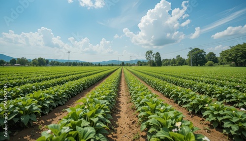 Lush Green Plant Rows under Blue Sky with White Clouds in Landscape