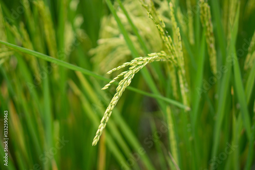 Lush green rice fields with thriving rice plants in the countryside, reflecting food security and agricultural sustainability